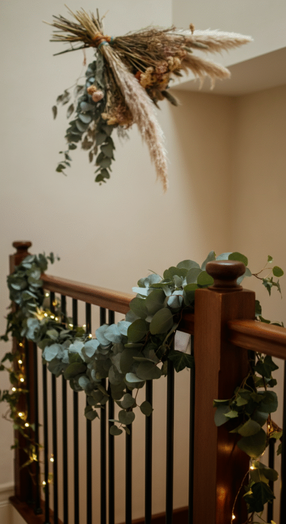 What’s Christmas without a little greenery? While traditional Christmas wreaths and garlands are wonderful, adding a boho twist with natural, organic greenery can make your hallway feel fresh and aligned with nature. Drape eucalyptus garlands, ivy vines, or even pampas grass along the railing or walls to give your hallway a sophisticated yet earthy vibe.
