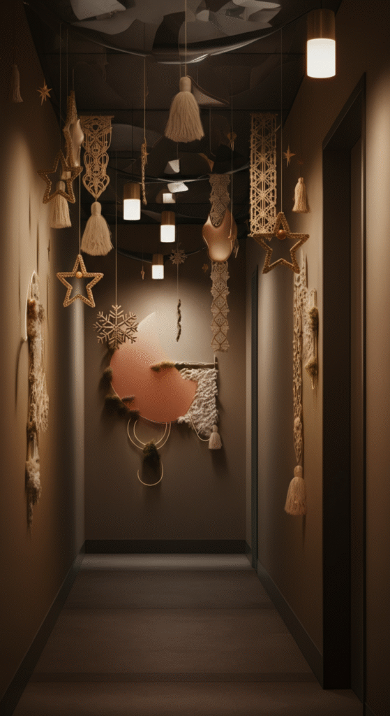 Macramé is one of the cornerstones of bohemian design, and it’s an absolute must when it comes to creating a boho Christmas hallway. The intricate knots and textured details of macramé bring a relaxed, hand-crafted feel to any space. For Christmas, consider hanging macramé wall hangings with festive designs such as stars, snowflakes, or even Christmas trees.