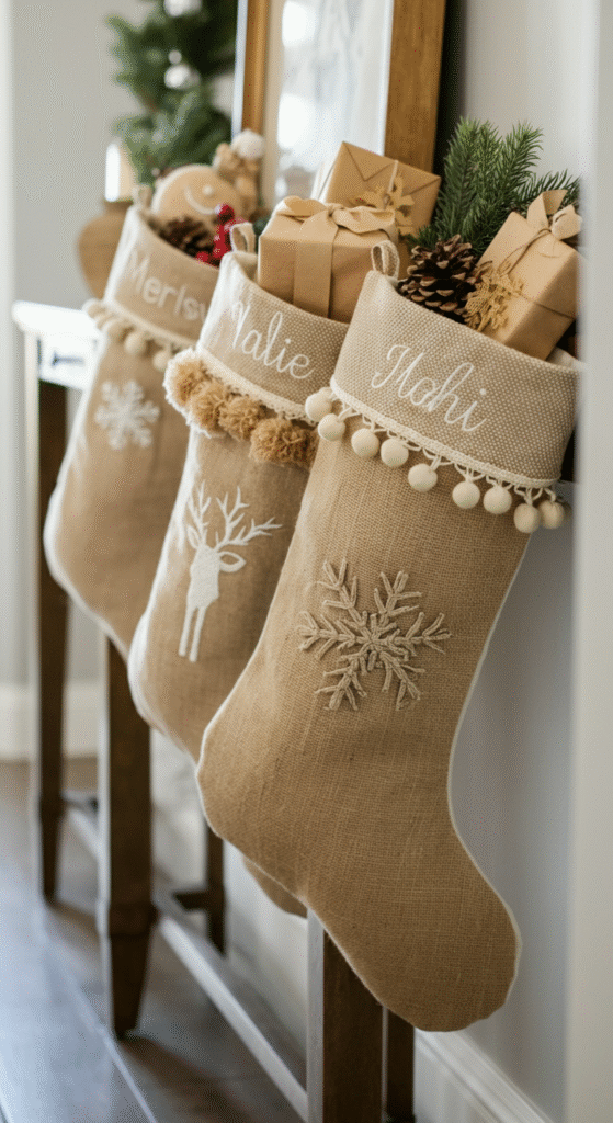 Personalize each stocking with names or initials in a boho-inspired font, or add a festive touch with embroidered stars, snowflakes, or geometric patterns. These simple yet thoughtful details make the stockings feel more like a work of art rather than just a place to hang gifts.