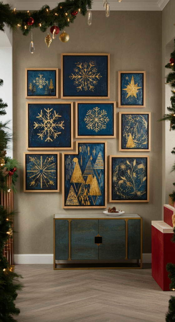 Bohemian decor thrives on creating visual interest through unique art pieces, so why not add some holiday-themed artwork to your hallway? Instead of the typical Christmas art, look for bold, abstract pieces that incorporate festive elements like stars, pine trees, or swirling snowflakes.