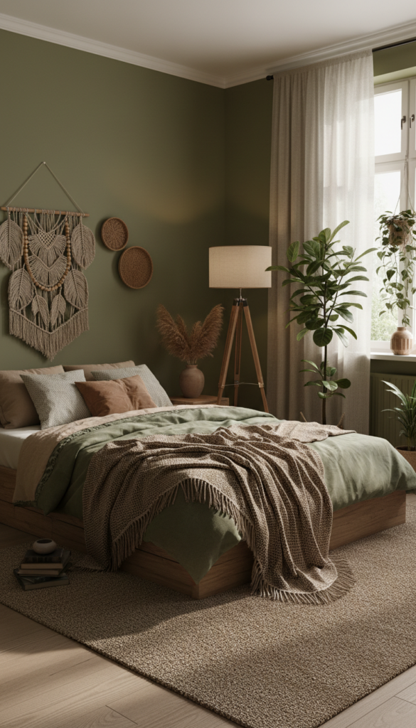In a boho setup, olive green works beautifully on walls, bedding, or even just cushions. Earth brown comes in through wooden furniture, leather poufs, or clay decor.