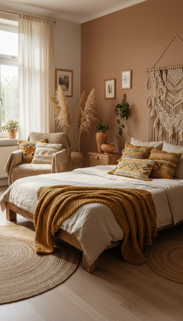 A boho bedroom feels relaxed and layered. Natural colors, mixed textures, handmade looking decor, and a space that feels lived in, not perfect.