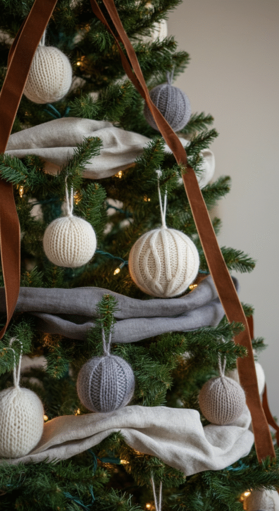Layering textures like knitted baubles, wool ornaments, and velvet fabrics creates depth and a cozy feel. Mixing soft fabrics with natural elements enhances the tree’s visual interest.