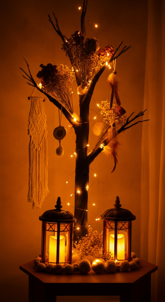 If you want to step up your Boho tree decoration game, consider adding small lanterns or candles around the base of your tree. Battery-operated LED candles can give the same soft, flickering glow without the fire hazard, making them an ideal addition to any Boho Chic tree setup.