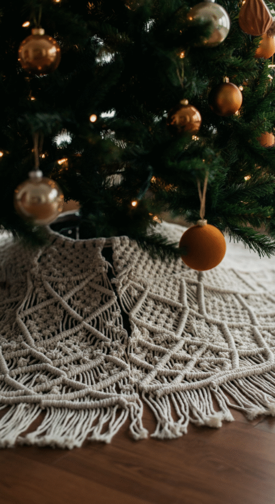 A handmade macramé tree skirt is a quintessential Boho item that ties everything together. The intricate knotting patterns add texture and depth, while the neutral colors keep the look grounded and cohesive. Macramé tree skirts can be found in various sizes and styles, allowing you to choose one that best complements your tree.