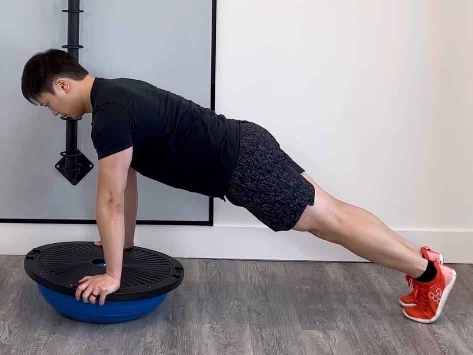 - Set the Bosu dome-side down and hold the flat side in a plank.