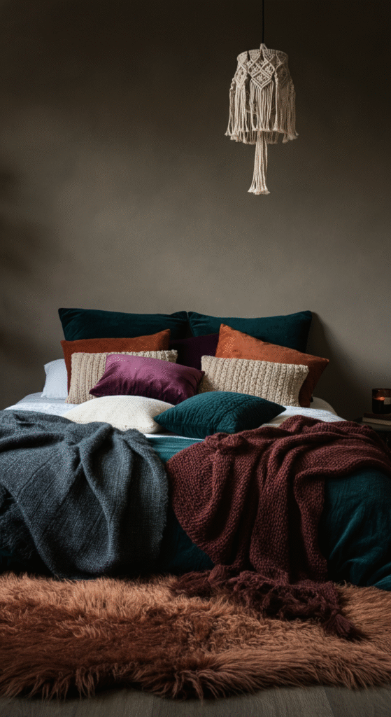 When it comes to boho bedroom design, layering is everything. From textured rugs to throw pillows and bed linens, a layered look creates warmth, comfort, and visual interest. Start by layering a plush area rug under the bed—think oversized, soft, and inviting. Next, pile up blankets and throws in varying colors and textures—knit, fringe, and woven fabrics work particularly well in this space.