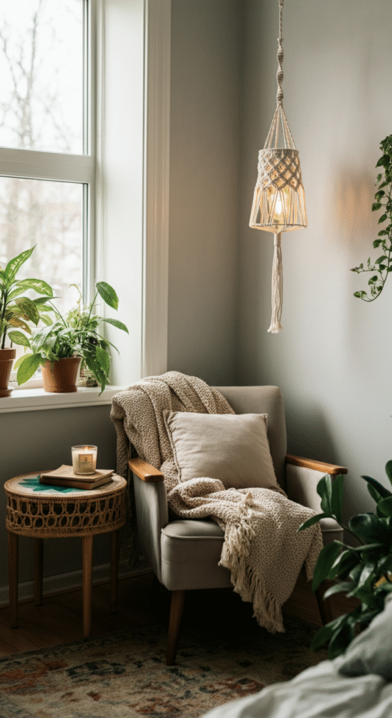 One of the beauties of bohemian interiors is the ability to create cozy, inviting corners that feel like little sanctuaries. A corner retreat is perfect for those who like to mix function with style. Choose a corner of your bedroom and outfit it with a comfortable reading chair, an eclectic floor lamp, and a side table.