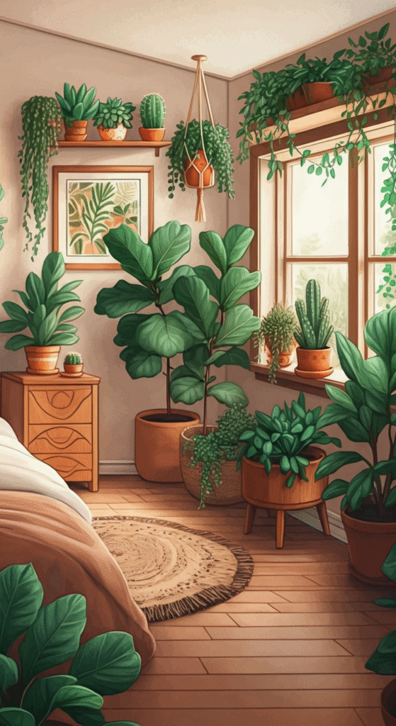 A boho-inspired room isn’t complete without some greenery. Indoor plants breathe life into any space, and their presence in the bedroom adds a natural, earthy touch. For a balanced look, position plants in various corners and even suspend them from the ceiling or walls.