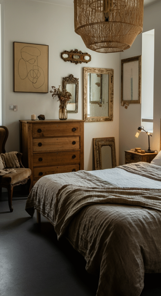A truly boho bedroom layout thrives on the combination of old and new. The trick is mixing vintage finds with modern pieces to create a space that feels timeless and lived-in. Think of pairing an antique wood dresser with a sleek, modern bed frame or using an old, reclaimed wood headboard with contemporary side tables.