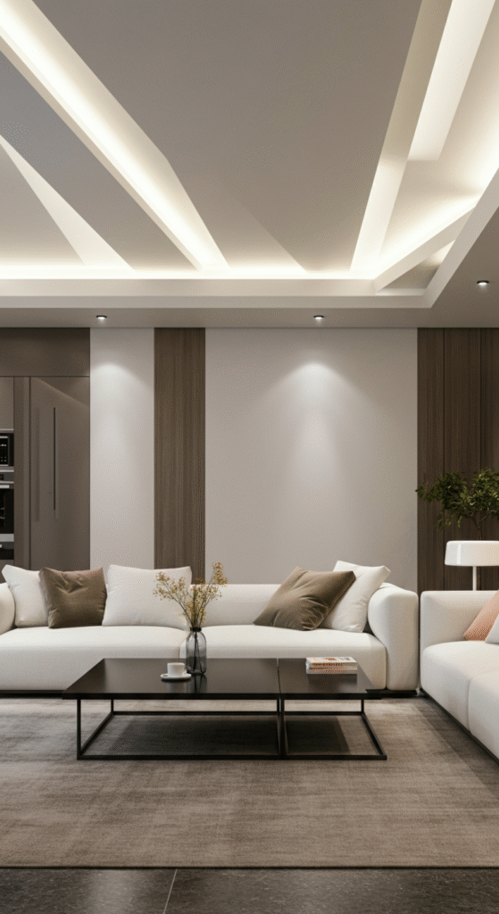 A minimalist approach can be a game-changer when it comes to ceiling design. Clean, white ceilings without excessive detailing lend a sophisticated, airy feel to the living room. This design focuses on simplicity and elegance, creating a serene and calming atmosphere.