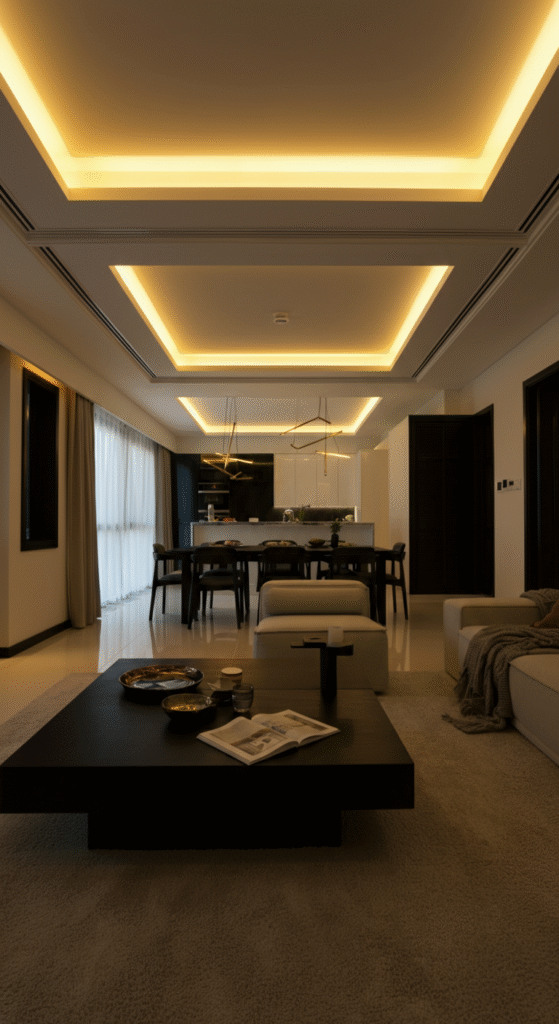 LED lights installed around the perimeter of the ceiling highlight the structure, emphasizing its depth and providing soft, ambient lighting perfect for evening relaxation. Whether you’re watching a movie or hosting friends, tray ceilings create a dramatic effect without being overpowering.