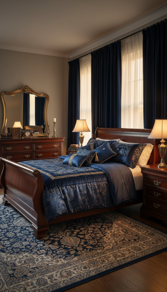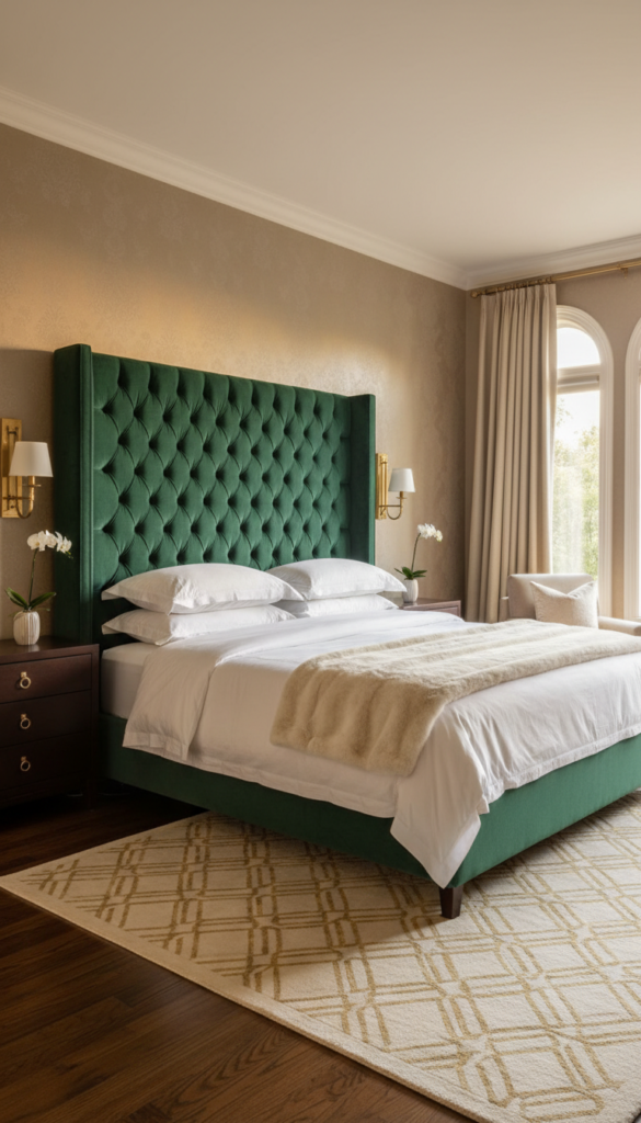 Nothing says luxury quite like a button-tufted headboard. This style anchors the room with a sense of sophistication and softness. A tall, upholstered headboard in deep velvet—think navy, emerald, or charcoal—adds texture and acts as a comfortable backrest for late-night reading. It creates an immediate focal point that feels plush and inviting.