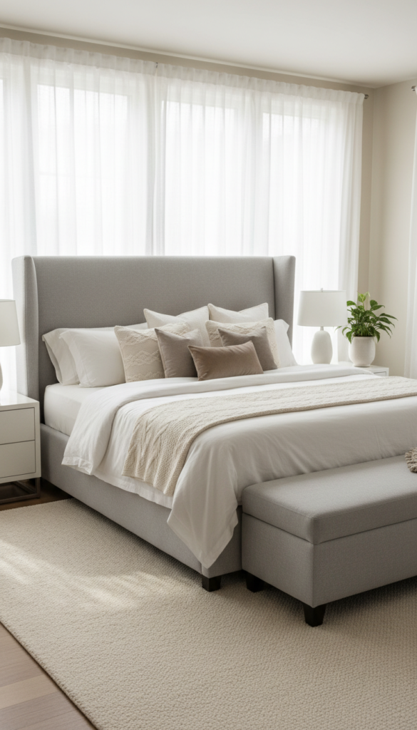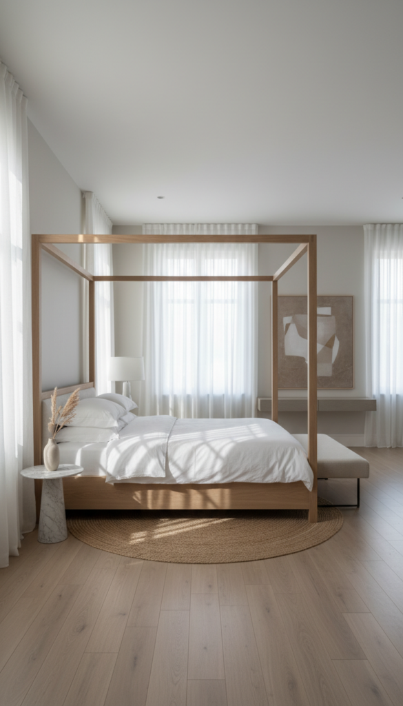 If you have high ceilings, a four-poster bed is the ultimate statement piece. It draws the eye upward and adds a sense of architectural structure to the room. While traditionally associated with ornate carvings, modern versions feature clean lines and simple wood finishes. This style creates a “room within a room” feeling, offering a sense of privacy and grandeur without feeling cluttered.