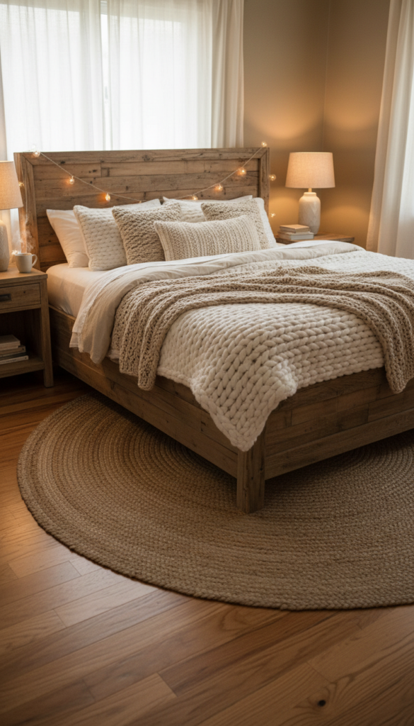 For a warm, grounded aesthetic, you cannot go wrong with natural wood. A chunky, solid wood frame brings organic texture into the bedroom. Whether it is a reclaimed oak with visible knots or a polished walnut with a mid-century vibe, wood pairs beautifully with crisp white linens. This look is versatile, fitting perfectly into both rustic cabins and modern apartments.