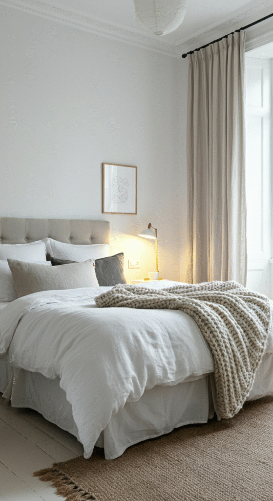 White walls paired with linen bedding. Cotton curtains. A knitted throw. Maybe a tufted headboard. All of these bring elegance without needing bold colours.