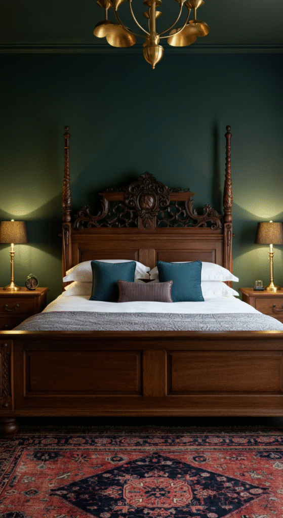 4. British Heritage Bedroom with Dark Wood and Deep Colours