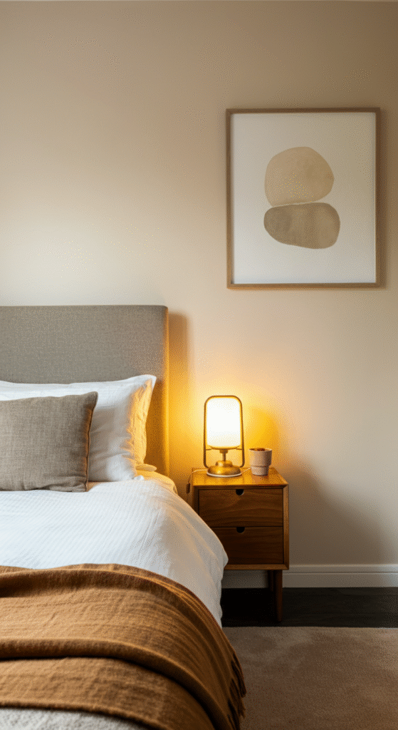 Choose two or three colours only. Maybe oatmeal, soft mocha, or muted grey. Keep accessories limited. Maybe one art frame. One bedside plant. A lamp with a warm glow.