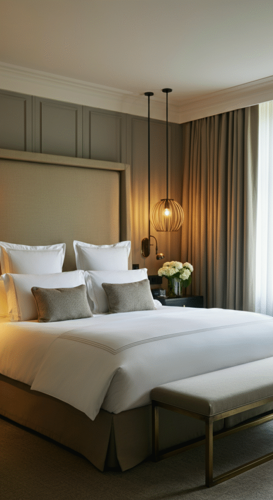 Think upholstered headboards, crisp white bedding, subtle lighting, a bench at the foot of the bed, or soft curtains that fall beautifully. Nothing feels too bold. Everything feels balanced.