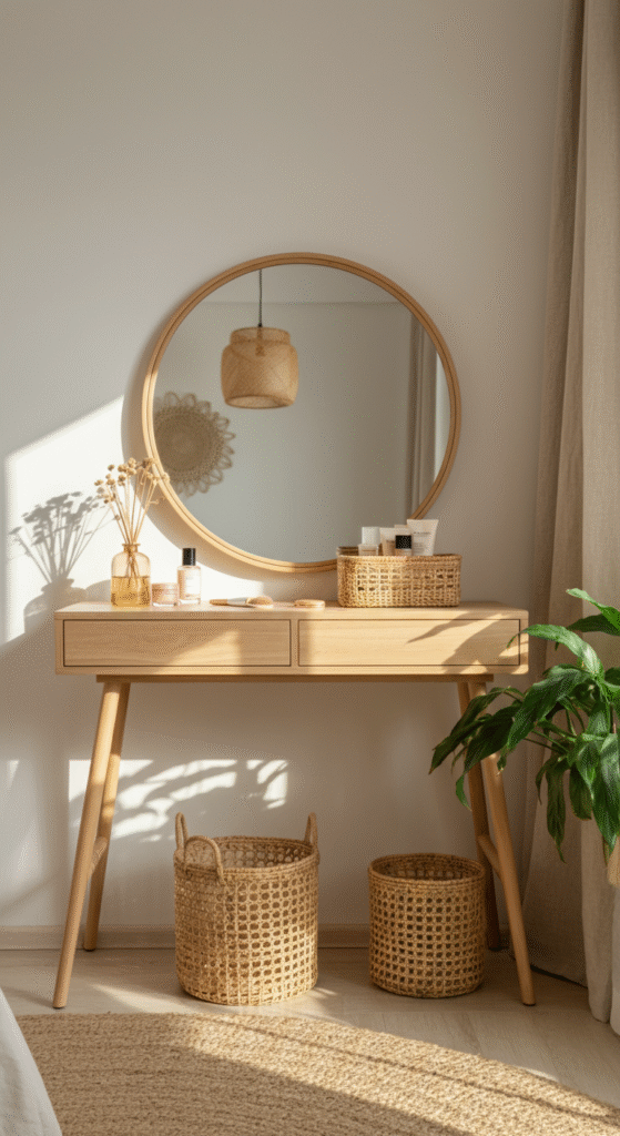 A natural wood vanity paired with rattan baskets is one of the easiest ways to bring an earthy boho vibe into your bedroom. The soft grain of light wood makes the space feel warm. Rattan adds that organic charm without trying too hard.