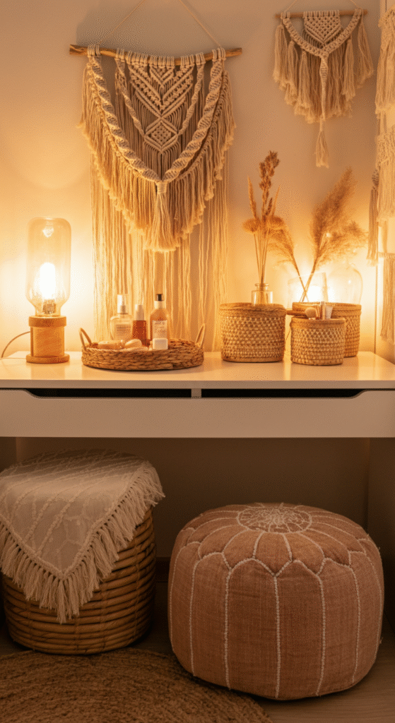 If your goal is a lived in look, layering textures is a must. A boho vanity often carries woven trays, macrame wall hangings, fabric poufs, or fringe details that feel soft and handcrafted.