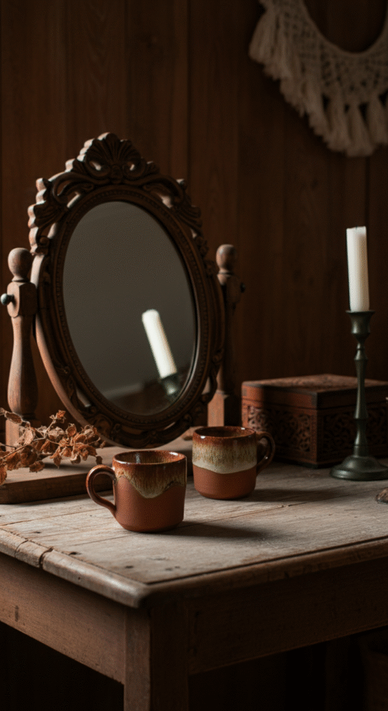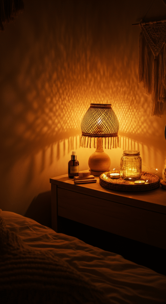A cozy boho look depends a lot on lighting. Soft, diffused glow instantly makes a vanity corner feel safe and gentle. Warm fairy lights, table lamps with woven shades, or even flameless candles change everything.