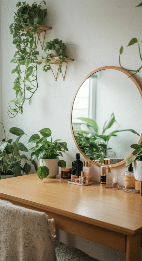 Use trailing plants, mini succulents, or leafy ones like pothos. Place them on floating shelves, hang them near the mirror, or keep a small pot right beside your brushes.