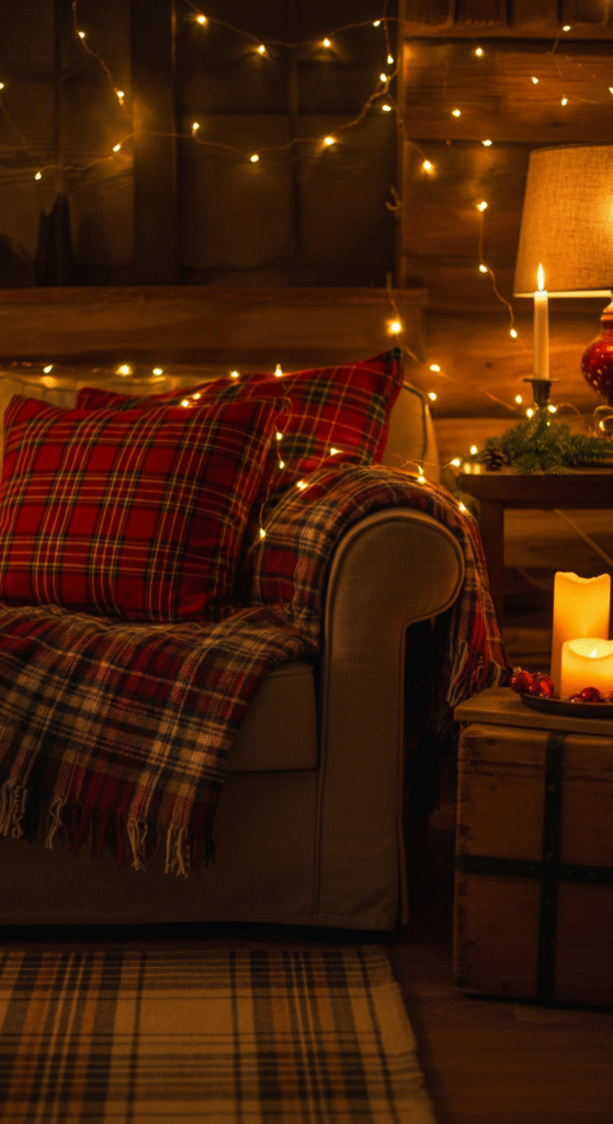 Nothing feels more nostalgic than a room dressed in reds and plaid patterns. This style takes cues from timeless Christmas films where cabins glow warmly and patterns practically wrap the whole scene. Red plaid pillows, a flannel throw, and a traditional tartan rug instantly create that storybook charm.