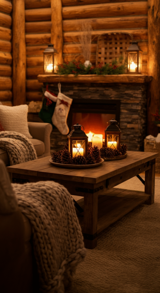If you love holiday movies set in snowy mountain cabins, this style is the closest you’ll get without traveling. Think wooden textures, chunky blankets, pinecone centerpieces, and natural elements that bring the outdoors in. Add lantern-style lights or faux fireplace visuals for the full cabin mood.