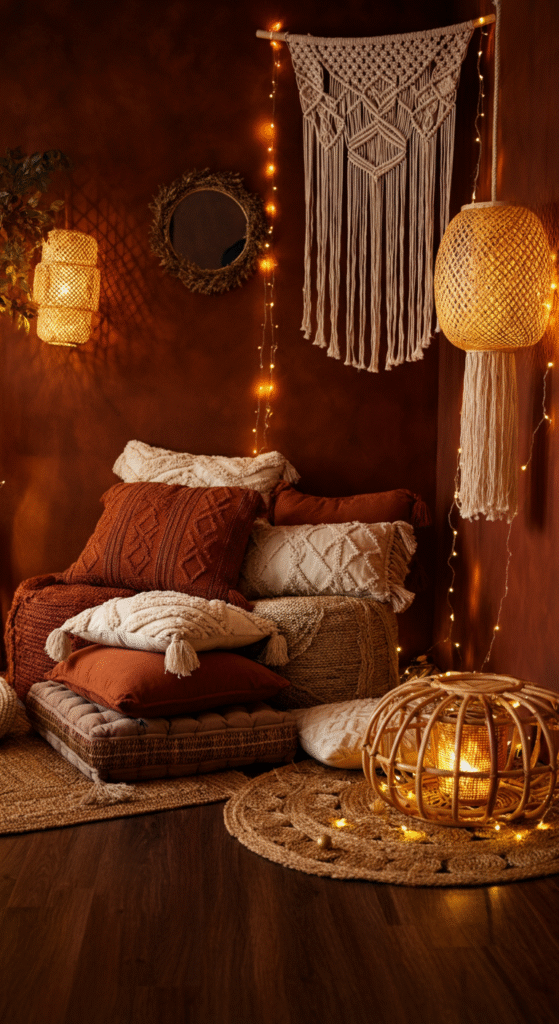 Boho decor adds creativity to your Christmas movie setup. Layered pillows, textured rugs, rattan furniture, and macramé hangings create a relaxed, free-spirited vibe. It’s the perfect style for people who want something different from the usual red-green Christmas theme.
