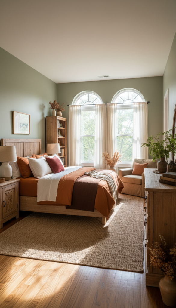 Earthy tones like warm oranges, deep browns, soft creams, and muted greens work best for creating a cozy, autumn-inspired bedroom.