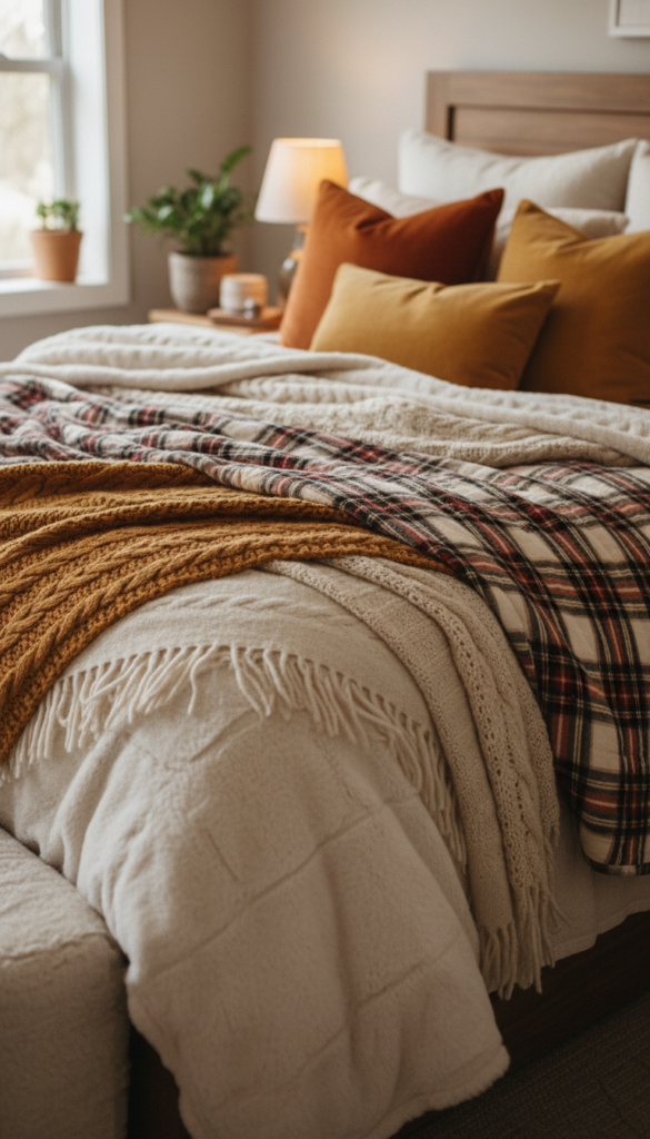 The key to creating a cozy fall bedroom is all about layers—both in texture and color. Think soft wool blankets, chunky knitted throws, and plush pillows. Layering your bed with different textures creates a visually appealing look while adding comfort for the cooler nights.