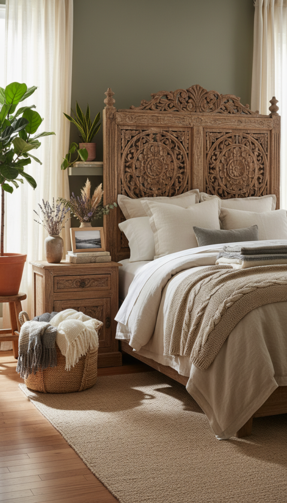 Fall is a time to celebrate the beauty of nature, and your bedroom can reflect that by incorporating natural elements into your decor. Wooden furniture, woven baskets, and dried flowers add an earthy, organic vibe that mirrors the outdoors.