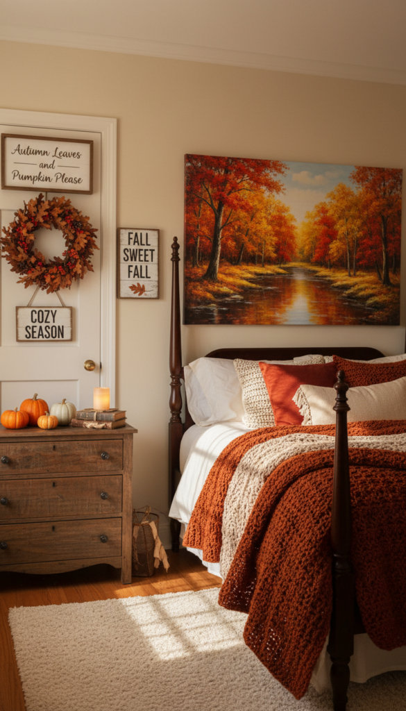 In addition to artwork, you can hang a seasonal wreath on the door, display a collection of pumpkins on your dresser, or even incorporate a rustic wooden sign with a fall saying like “Autumn Leaves and Pumpkin Please.” These small additions help bring the fall spirit to every corner of the room.