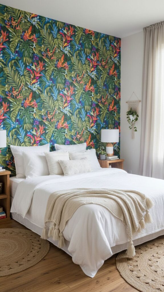 Bring the outdoors in with bold, botanical prints. Large-scale floral or jungle patterns create a stunning focal point behind a headboard. The best part about modern wallpaper is the peel-and-stick technology, making this a renter-friendly upgrade that requires no messy paste.