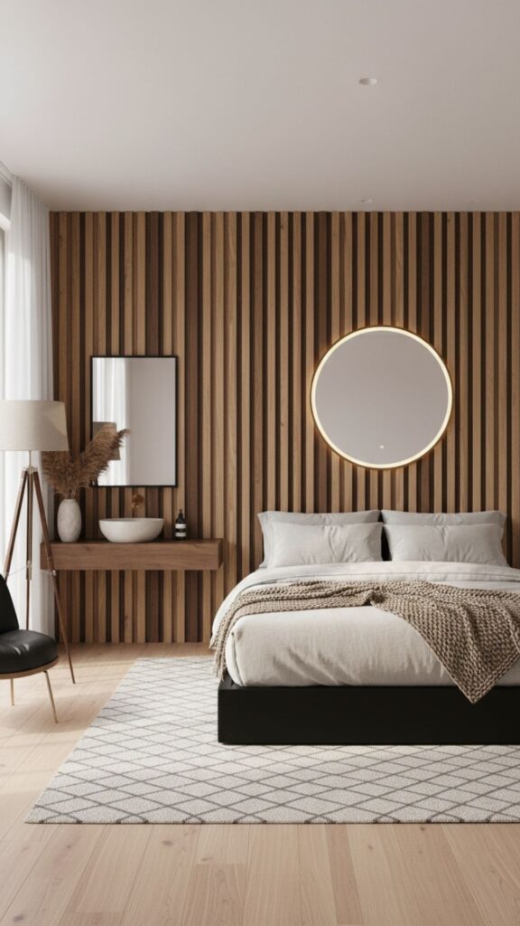 Inspired by Japandi and mid-century modern design, wood slats add warmth and texture. The vertical lines draw the eye up, making low ceilings feel higher. This look works exceptionally well behind a bed or framing a vanity area.