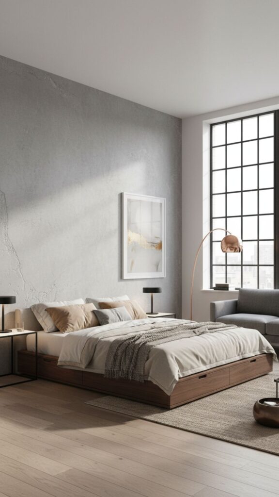 For an edgy, loft-style aesthetic, a concrete texture wall is unbeatable. It brings an urban, industrial vibe that contrasts beautifully with soft linen bedding. You don’t need real cement to achieve this; special texture paints can mimic the look perfectly.