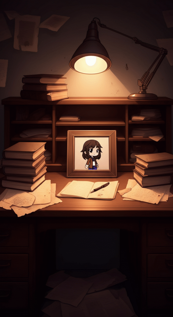 It is a mix of vintage academic decor with playful Gacha character styling, creating a moody but creative teen room.
