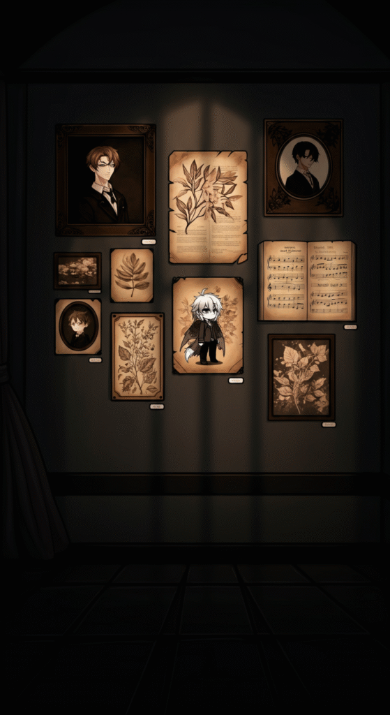 A Gacha themed moodboard can include character dialogue scenes, cutout scenes or story panels arranged like a comic strip. This blends narrative visual style with old world art which is honestly quite unique.