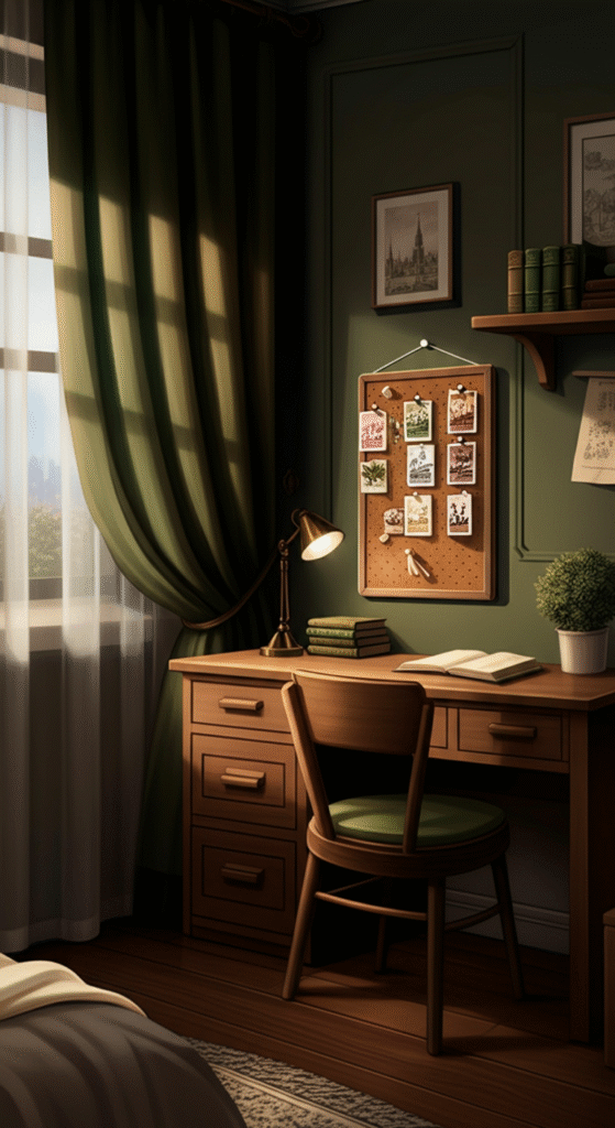 Dark academia rooms rely heavily on colours. Not bright ones but soft, muted shades that remind you of rainy afternoons, old book covers, aged parchment and shadow filled hallways.