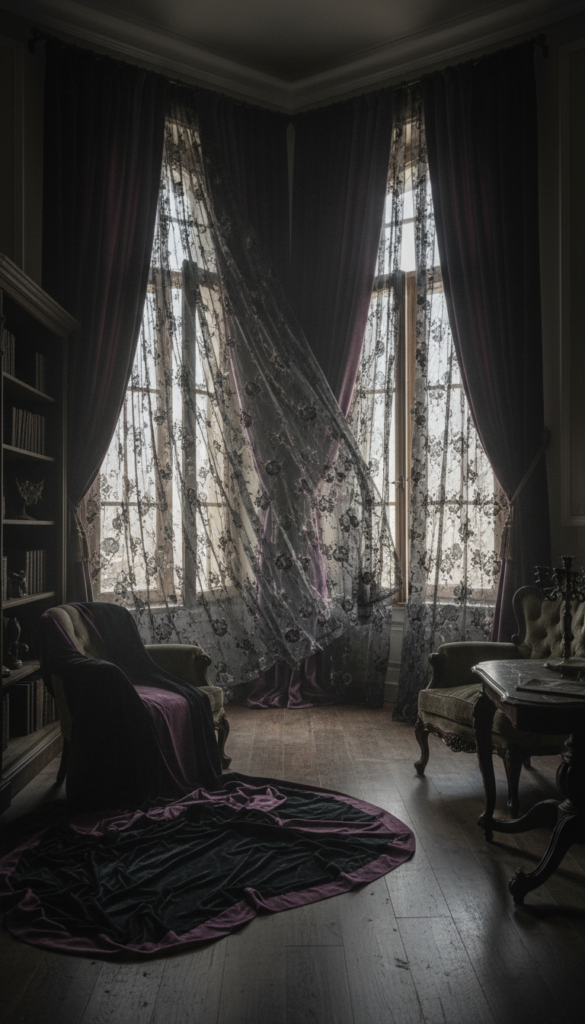 Gothic design is all about rich textures, and nothing screams Gothic more than sumptuous velvet or intricate lace curtains. Opt for dark colors like deep black, charcoal, or wine, which not only block out light but add an air of elegance and mystery to your room. These curtains will bring both drama and softness to the space, creating an intimate and spooky atmosphere for your Halloween nights.