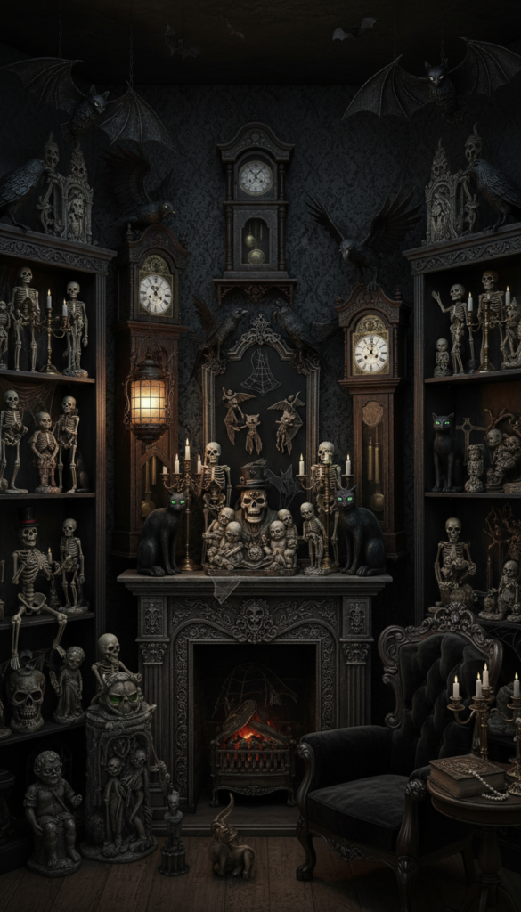 Adding subtle Halloween touches is a great way to make your Gothic bedroom a little extra spooky. Consider adding figurines of ravens, bats, skeletons, or eerie black cats to your shelves or mantels. These unique, creepy collectibles will give your space a playful yet unsettling vibe that’s perfect for the season.