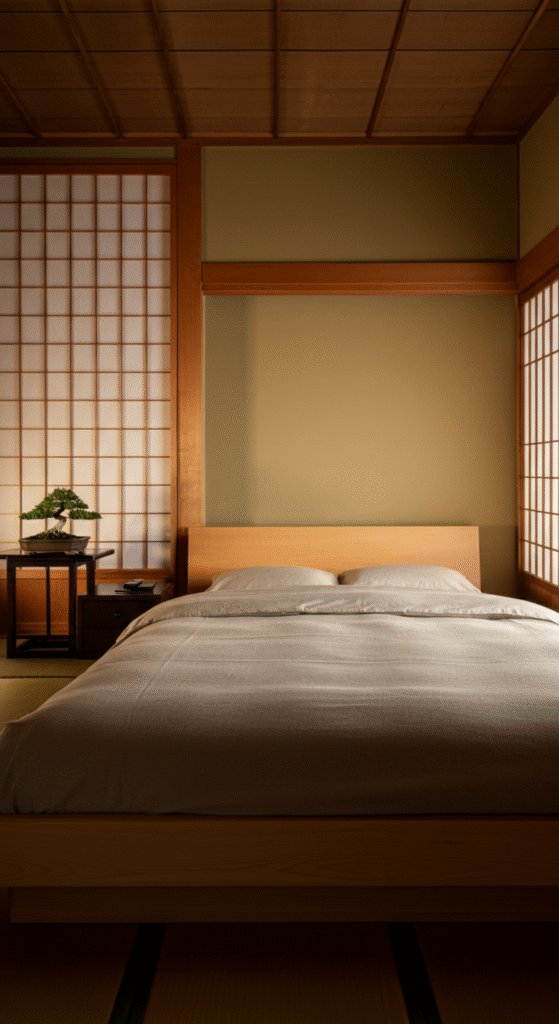 A Japanese-inspired bedroom combines minimalist design with natural elements. It focuses on simplicity, tranquility, and balance, using neutral colors, low furniture, and natural materials like wood and bamboo.