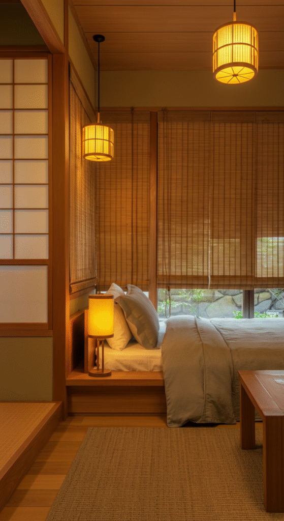 Lighting is crucial in Japanese interiors, with soft, ambient lighting creating a calm, relaxing atmosphere. Paper lanterns, dimmer switches, and floor lamps help set the right mood for rest and relaxation.