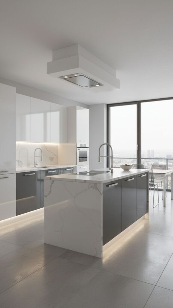 - Surfaces: Keep countertops and backsplashes uniform, using quartz or marble with subtle veining.