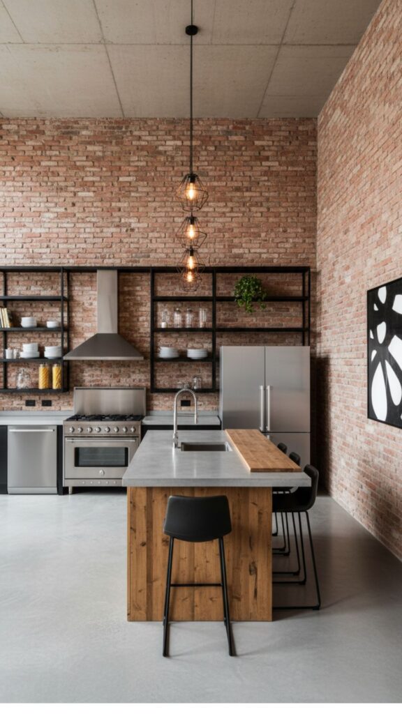 - Walls: Expose brick walls or use faux-brick paneling for texture.