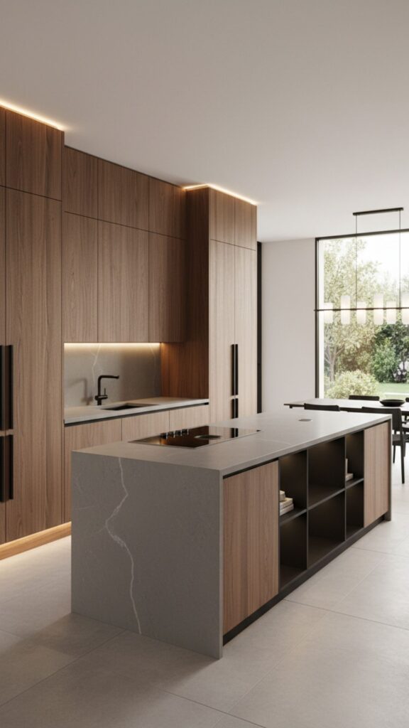 - Balance: Pair the wood with matte black or dark grey countertops for a chic contrast.