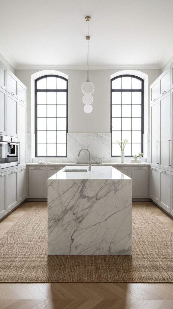- Surfaces: Use white marble with grey veining for countertops, backsplashes, and even islands.