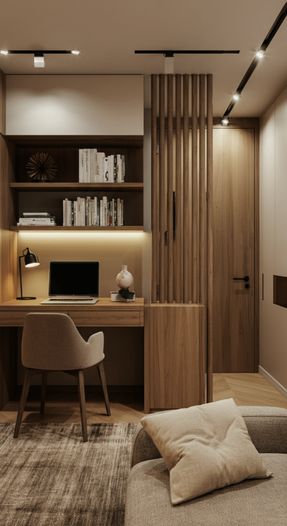 This design offers a dedicated work area that’s still part of the main living room, which is ideal for those who need to switch between work and relaxation.