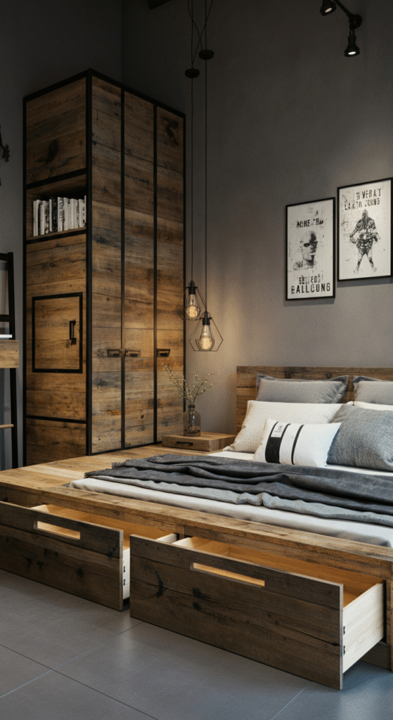 Reclaimed wood carries stories, textures, and imperfections that add real charm to a bedroom. When paired with metal headboards or pipe structures, you get a warm industrial look that feels both natural and edgy.